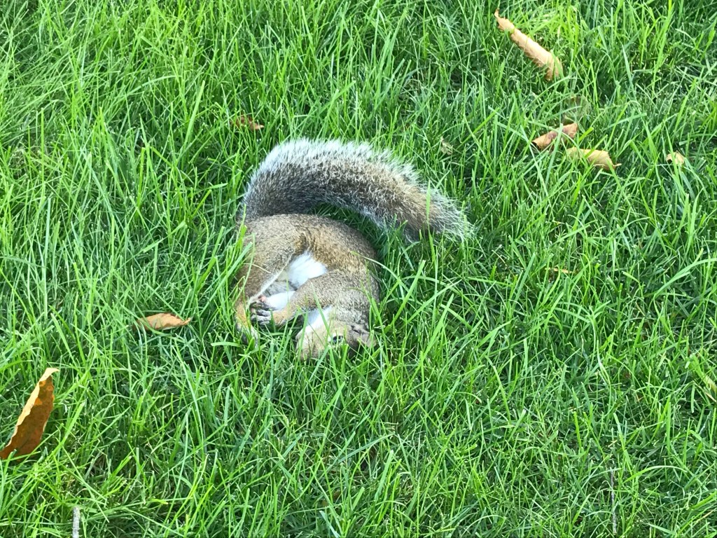 I returned the shovel, rode around the block yet again, stopped and took a photo of the squirrel. To send to Susan, with a text telling her I’d moved it onto the grass. A woman walking her dog, stopped and asked me what had happened. I told her the sad story, and she said her dog – who was lunging at his leash – would be happy to take care of things. We agreed that would be brutal and horrible and something we couldn’t bear to witness. We agreed the only thing I could do was leave the poor squirrel where it was to eventually die. You know, let nature take its course.