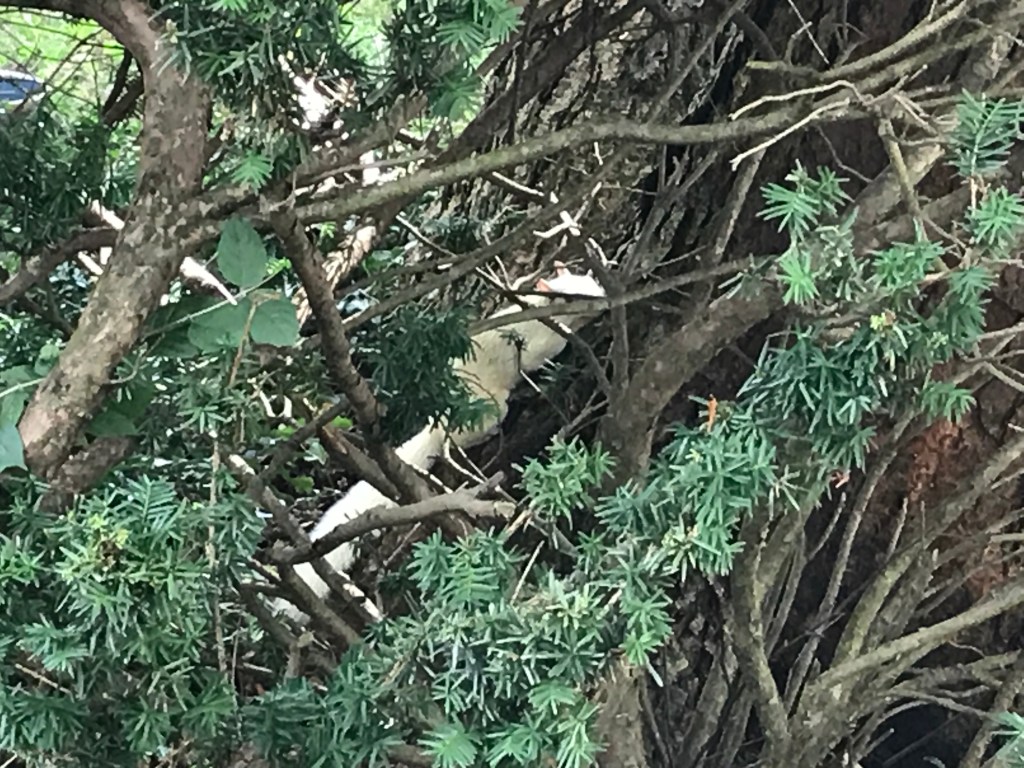 P.S.: I rode by the spot of the “incident” the next day … and the squirrel was still there. Lying in the exact same position in the same day, but dead. Very, very dead. I was a little bit relieved. And sad. On the way home, I saw something special: An albino squirrel. Was it the ghost of the squirrel I’d killed? Perhaps. The photo below was the best I could get, as the albino squirrel wouldn’t cooperate when I asked him to stay still and move out from behind all the branches. Was he afraid of me? Had he heard about the killer bike?