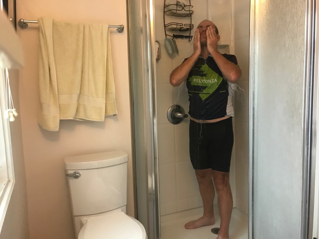 I have done a few shower-laundry loads on bike trips, usually when it rains and I’m already wet and a bit muddy. But my preference is the sink. It seems more sanitary, but probably isn’t. Plus, it’s difficult to take off a sopping-wet bike jersey in the shower. You could strangle yourself and/or drown! But it’s definitely a good option.
