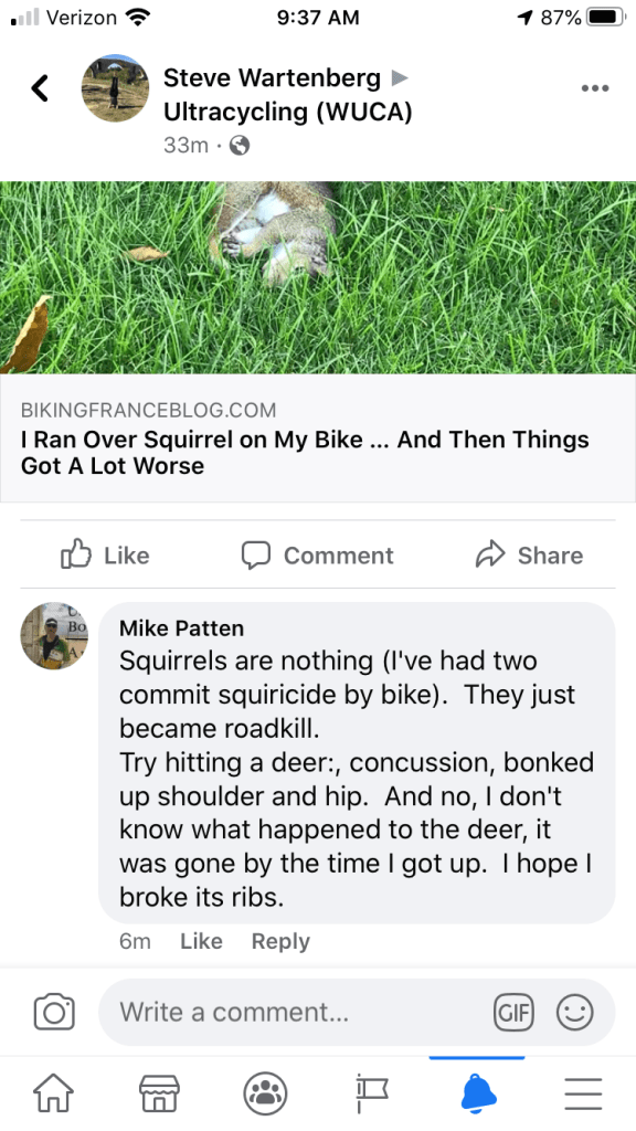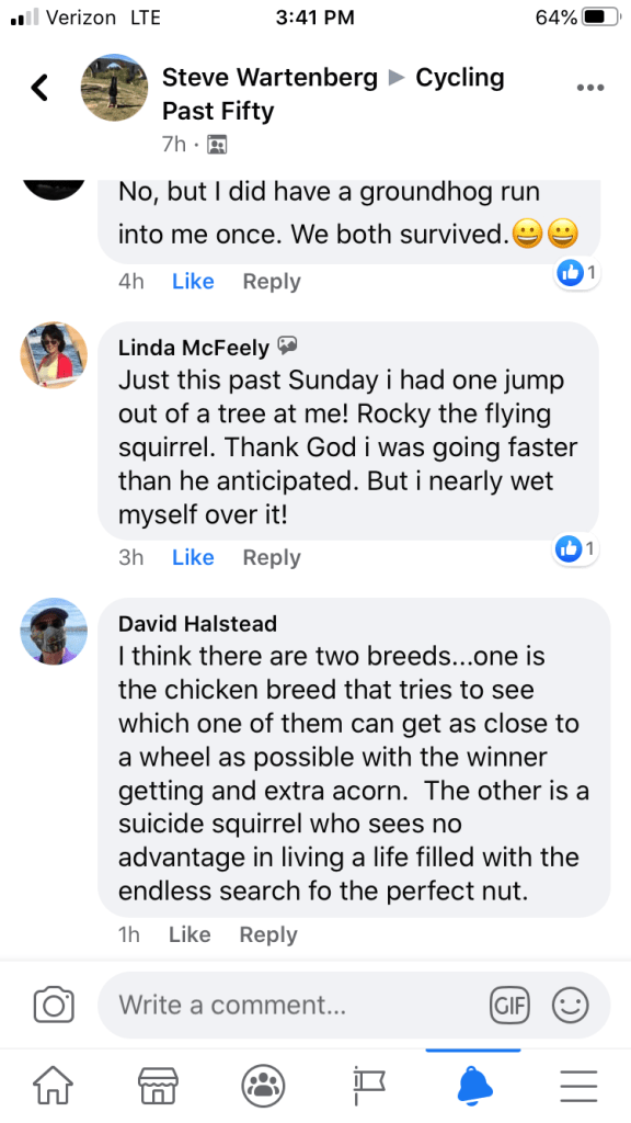 Joe Catizone: Squirrels are the worst! Especially this time of year here in the Northeast. They do what I call it the Death Dance. They run out from nowhere right I. Front of you then dart back and forth trying to decided which way to go! As if us road cyclists don’t have enough to watch out for!