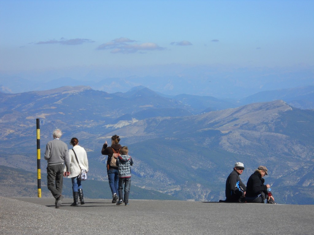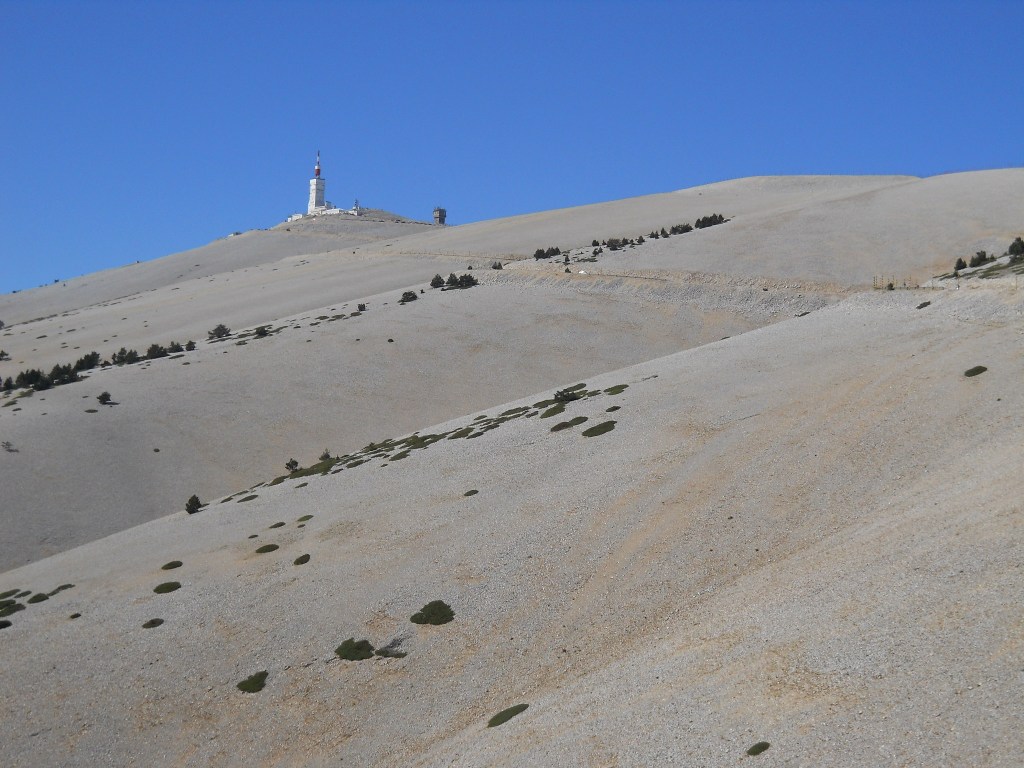 Past the Tom Simpson memorial and, finally, to the summit. I was the only person up there. No push carts with candy and sausage. The gift shop was closed. My plan was to head down to Malaucene, then back to the summit, down to Sault and back up to the summit. This is the recommended route: Hardest to easiest, but any order will do to join the club.