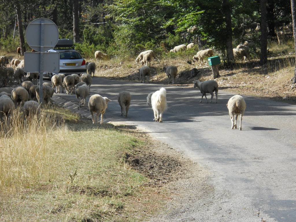 Headed out of the café and … had to wait about 15 minutes while a Shepard walked his huge flock of sheep across the road. There were at least 200 or 300 sheep in the flock. And several dogs. Large, white dogs with spikey collars.