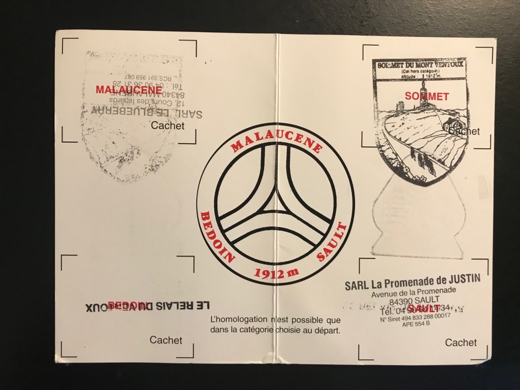 I’d really done it and was a Cingle (#3526). All I had to do was ride down the mountain. Safely. “Oh crap, wouldn’t it be horribly ironic if I crashed on the final descent and never mailed my stamped passport in and am never officially recognized as a member?” I asked myself. And then rode down the Ventoux very, very carefully.