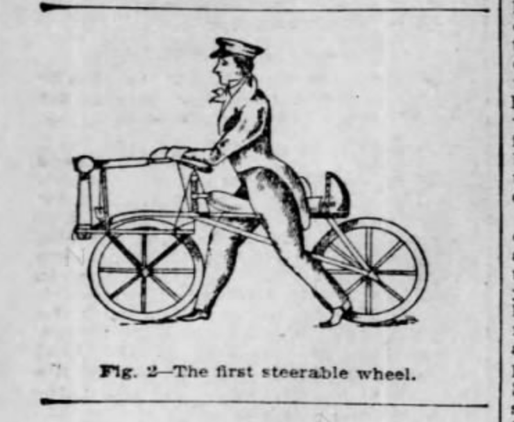 This newspaper story refers to the “running machine” invention of Baron Karl Von Drais, a member and employee of the Court of the Grand Duke of Baden (Germany). There were still no pedals, the wheels were made of wood and there were very few proper, paved roads upon which to “skate” this two-wheeled machine upon. Let’s just say it could be a rough ride. However, it was a lot lighter than previous hobby-horse-type vehicles and … steering! Drais devised a way for the rider to turn the front wheel while they flapped their feet, Flintstones style, or coasted down a hill, working hard to keep their balance – and figure out a way to slow down or stop at the bottom of the hill. Yep, still no brakes – other than jamming your heels into the ground.