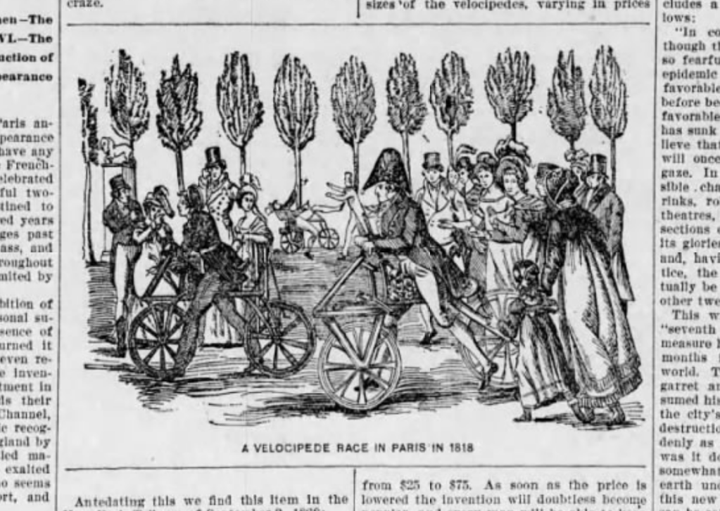 An immense concourse of spectators assembled yesterday at noon, at Luxemberg [Luxembourg Gardens], to witness the experiments with Draisiennes, a species of carriage moved by machinery without horses. The crowd was so great that the experiments were but imperfectly made. The machine went, however, quicker than a man running at speed, and the conductors did not appear fatigued. About three a lady appeared in a Draisienne, conducted by the chasseur [servant] of the Baron de Drais, who made with it several turns in the alleys, in the midst of the crowd … The machine ascended with facility the hillocks [small hills] which are placed in some parts of the garden. The Draisiennes appear to be convenient for the country, and for short journeys on good roads.