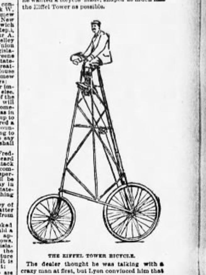 The bike maker wanted to call it the Giraffe Bike, but Lyon was paying for it and “insisted on calling it the Eiffel Tower Bicycle.”