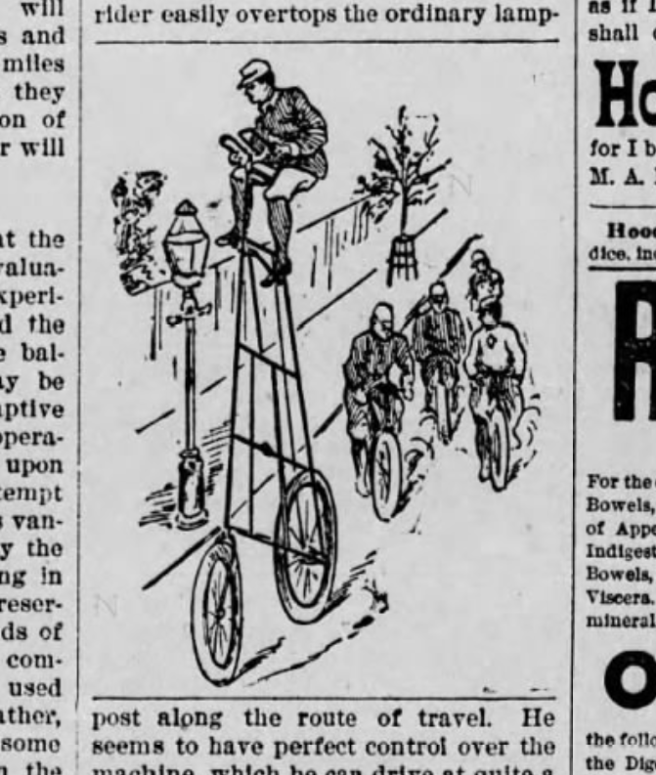 According to the story in The Sun, “from the ground to the saddle of the bicycle is a distance of ten feet.” However, Lyon and his tall bike travelled to Australia in 1897 and a story in The Age newspaper called it “a bicycle measuring 13 ft., 6 in. in height.” But wait, an article in the September 1, 1898 The Yonkers Statesmansaid “the Eiffel Tower bicycle, a wheel 19 feet high, will appear in the [Saratoga Floral Fete and Battle of the Flowers parade].”