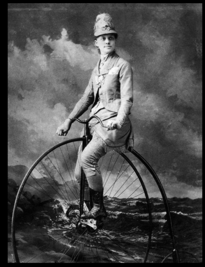 My fun & true bicycle-history stories have been dominated by the men. So far. Hey, it’s not my fault: That’s the way society worked in the 1800s. And then: The bicycle! Women were not to be denied and, despite some pushback from the men, they took to the wheel in droves, wearing long skirts and tight, lung-constricting corsets (at first).