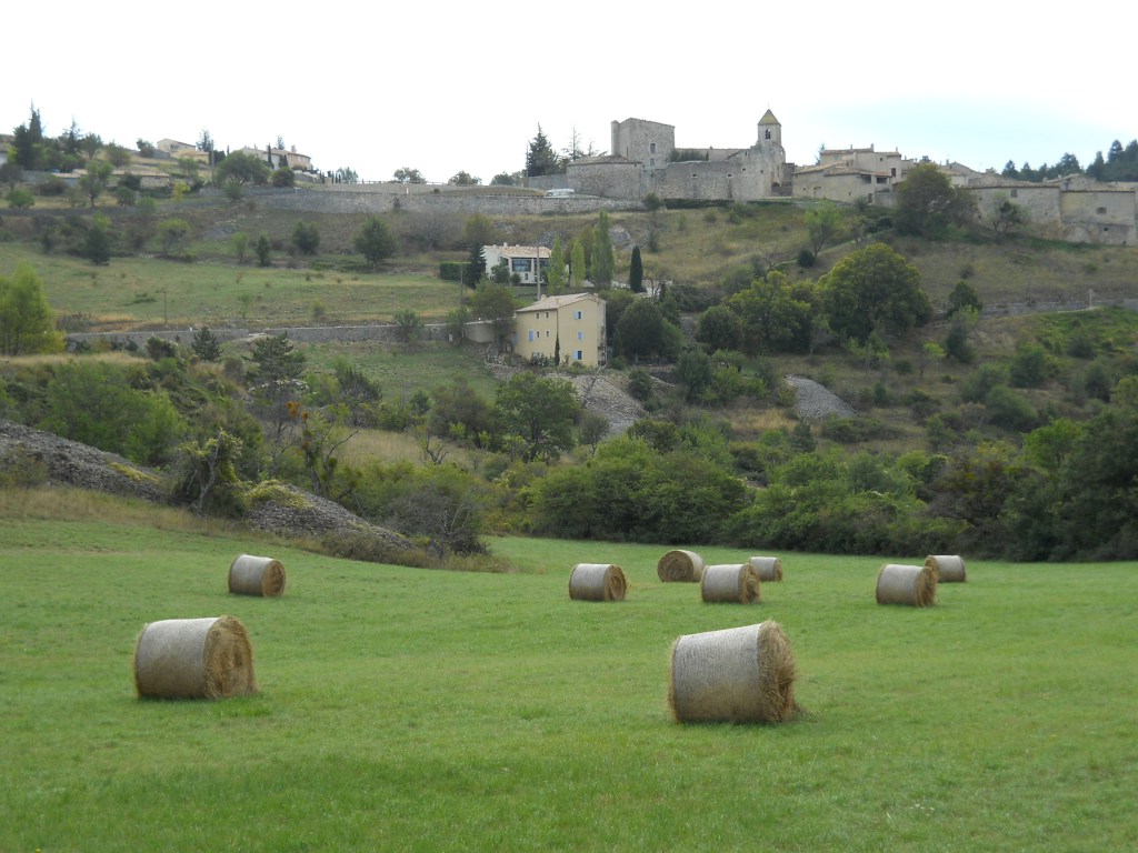 I was heading down a long, lovely hill from Sault, in Provence, to the town of Aurel. Then, more downhill, around a bend … and here was this field, and these bales of hay, with a view back up the hill toward Aurel.