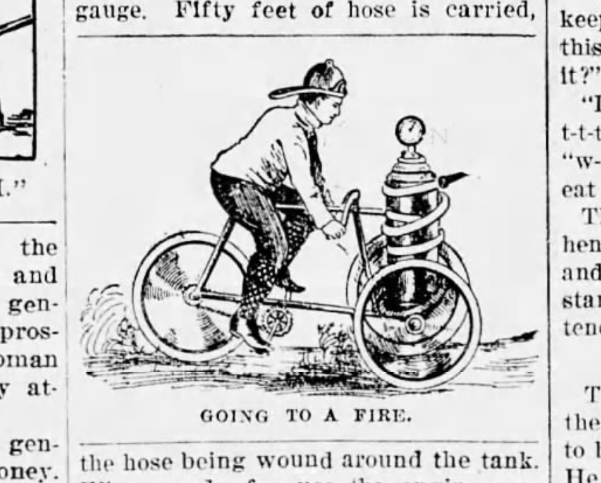 Water! Firefighters need water. And so, “An inventor of Racine has secured a patent for a new bicycle fire engine which will be of value at places where there are good roads,” according to the December 5, 1896 edition of The Herald, Lake Geneva, Wisconsin. Here it is …
