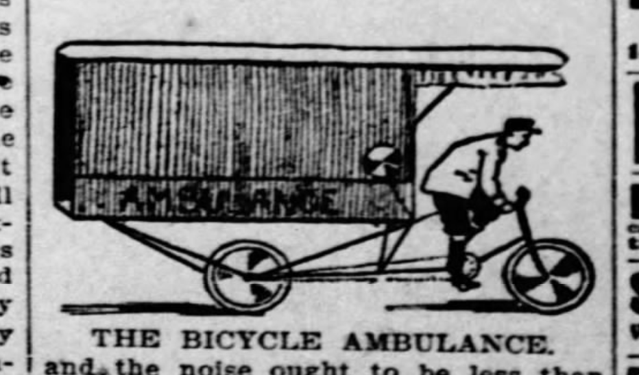 An enterprising undertaker [in Vancouver, Washington] with a bicycle has so rigged up the machine that he uses it with ease to carry coffins, big and little, into the country districts, and the odd sight of a man scorching along on a bicycle with a coffin strapped in front of him has been seen several times lately. The Daily Chronicle, De Kalb, Illinois, January 2, 1896.