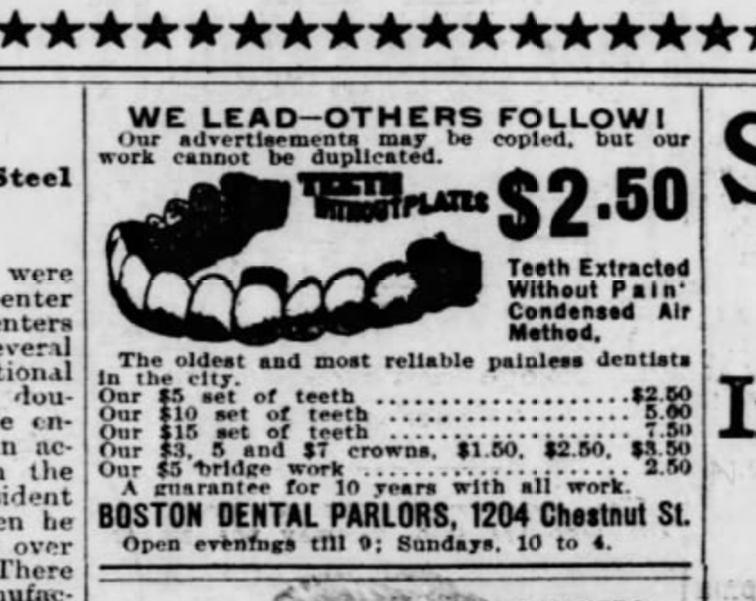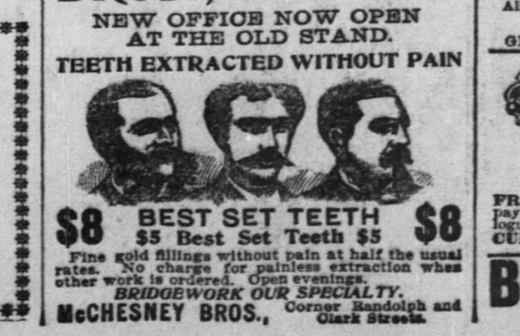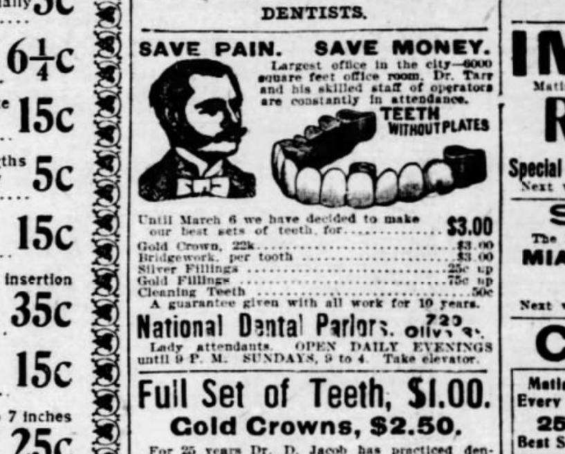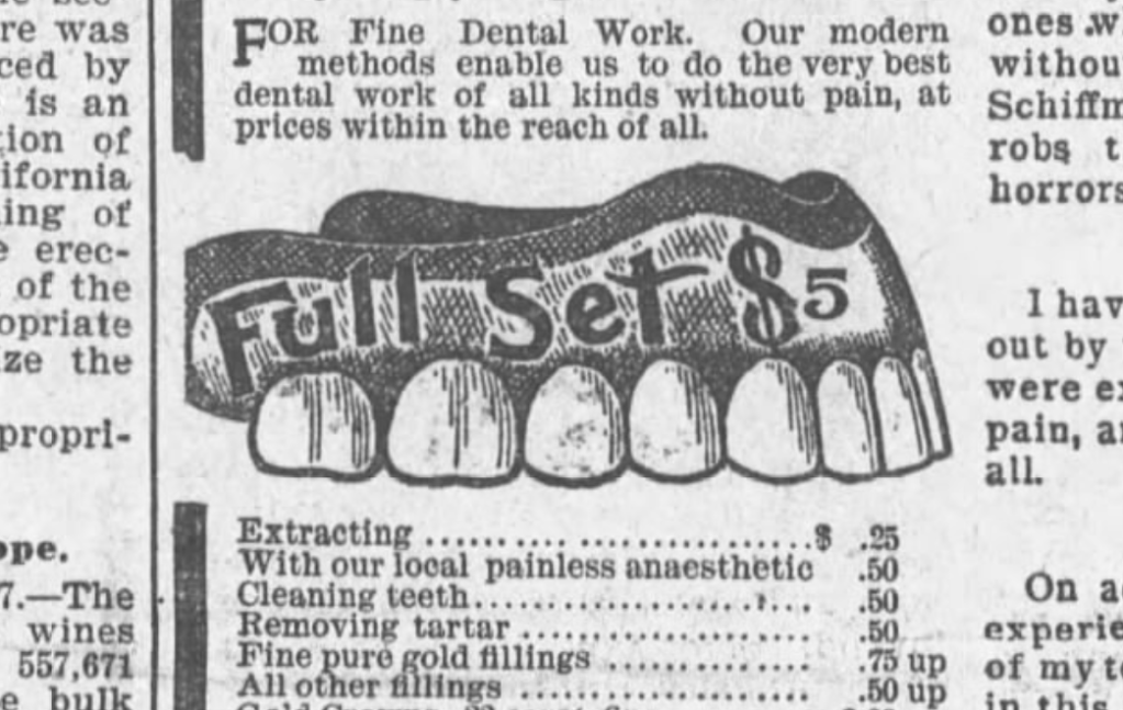 The doctor then asked to look at the teeth, and when Mrs. Davis opened her mouth he dexterously inserted his finger, lifted out the teeth, put them in his pocket, mounted his wheel, with the remark to the lady, “No money, no teeth.”