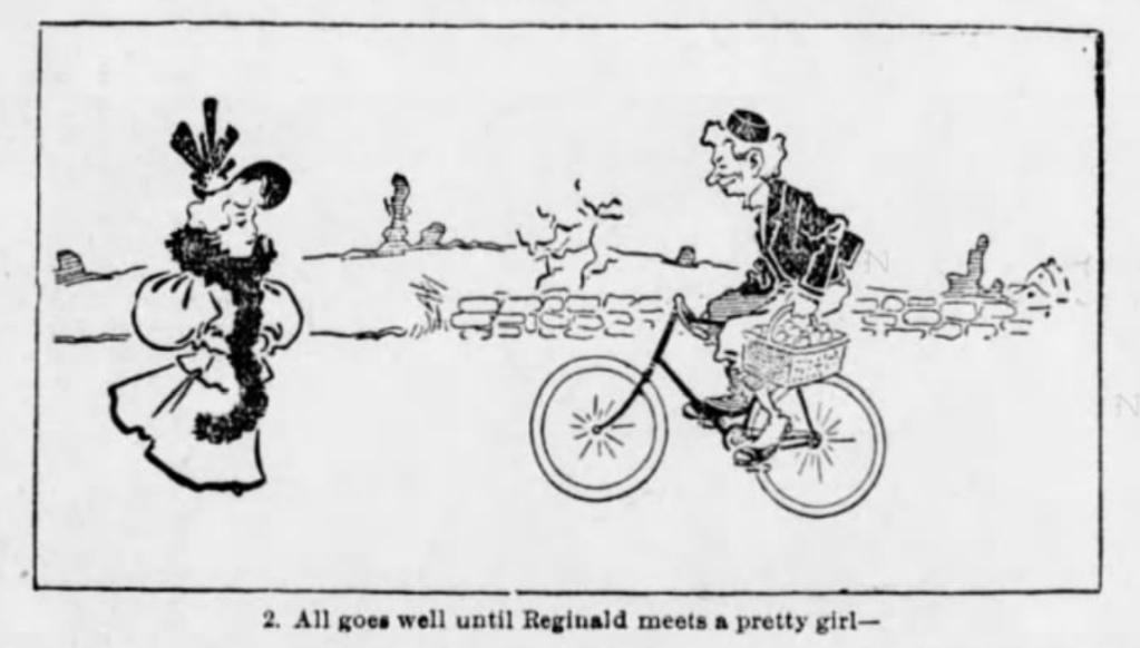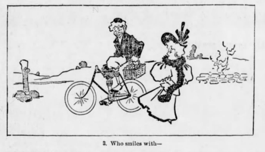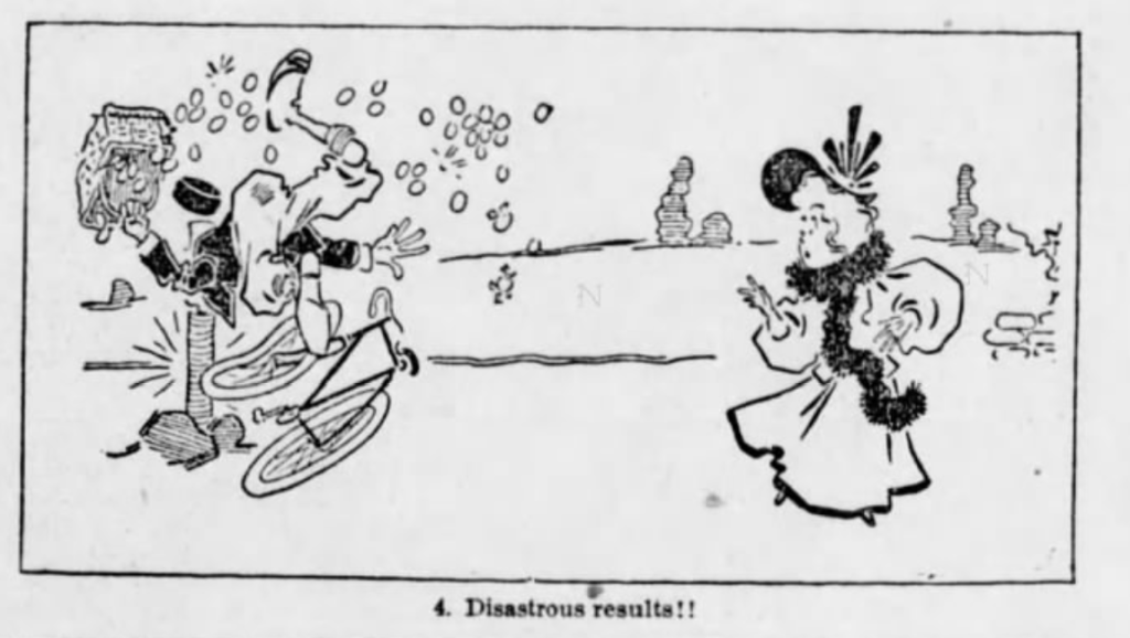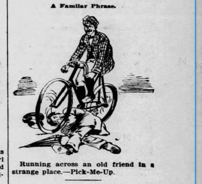 There’s nothing especially funny about a cycling crash, especially if you’ve been in one. Nevertheless, bike-crash jokes were quite popular back in the 1890s because, well, there were a lot of bicycle crashes: bike v. bike; bike v. horse, bike v. trolley car, bike v. horse-drawn wagon or carriage. I bet most of these jokes were written by non-cyclists.