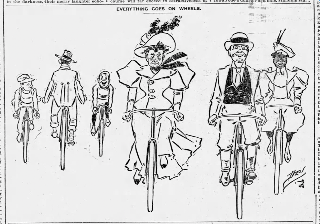 The peak of the first great bicycle boom was from 1895 to 1898. The widespread introduction of the safety bicycle in the late 1880s, followed soon after by pneumatic wheels, fueled the boom. It infiltrated every facet of society: business, sports, religion, relationships, the suffrage movement, crime, medicine … and humor. Newspapers were chock full of jokes back then and a significant percentage were about bicycles. Some of these jokes were actually funny!