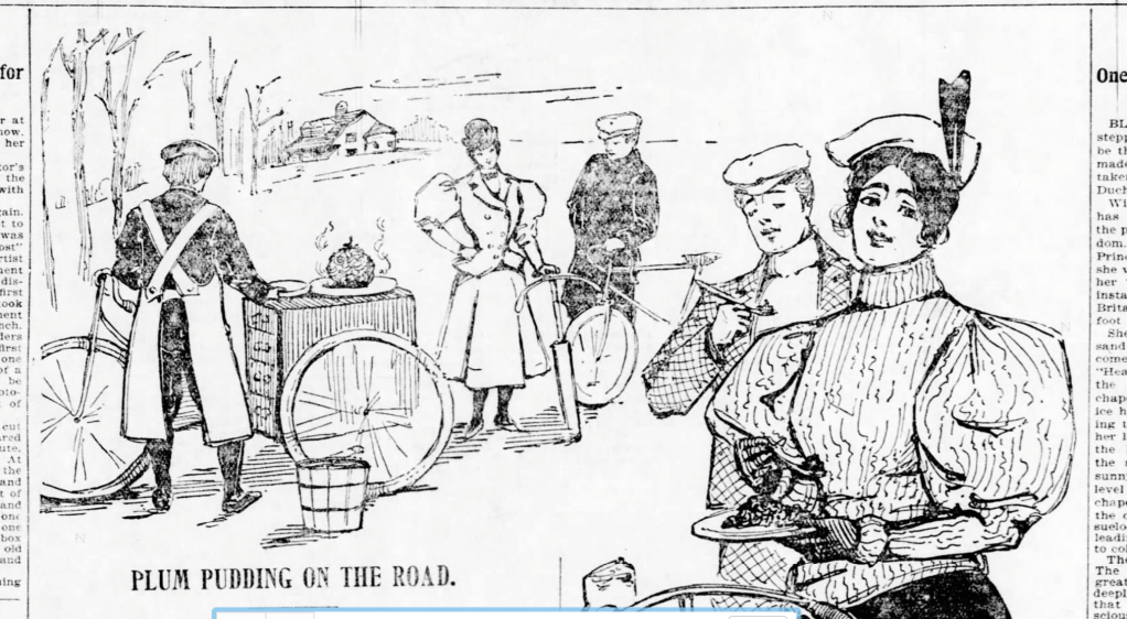 According to the article: “The plan of the bicyclist caterer is to start out early New Year morning and serve plum puddings all day to riders … Opening down from the front of the tricycle is a table. Upon this the bicyclist is served. A chafing dish can be placed upon it or a little oil stove. The caterer spreads a cloth on the board and gets out his cooking apparatus and the pudding. The bicyclist does all the rest.”