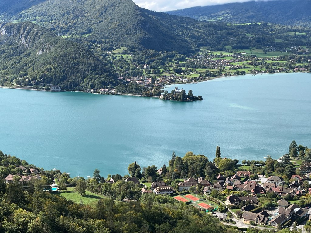 And then, a long, long downhill to the town of Villard and then north and back onto the path on the other (western) side of the lake and the last 22 Ks back to Annecy. It’s all flat along an old, abandoned railroad track. My plan was to stop in the town of Duingt. There’s a patisserie there that makes delicious baguette sandwiches and a spot just across the road where you can sit on a bench by the edge of the lake and eat and enjoy the spectacular views. I did this twice on my 2022 trip and have been looking forward to a sandwich and a cold Orangina and a picnic by the edge of the lake for weeks. My mouth began to water as I approached Duingt.
