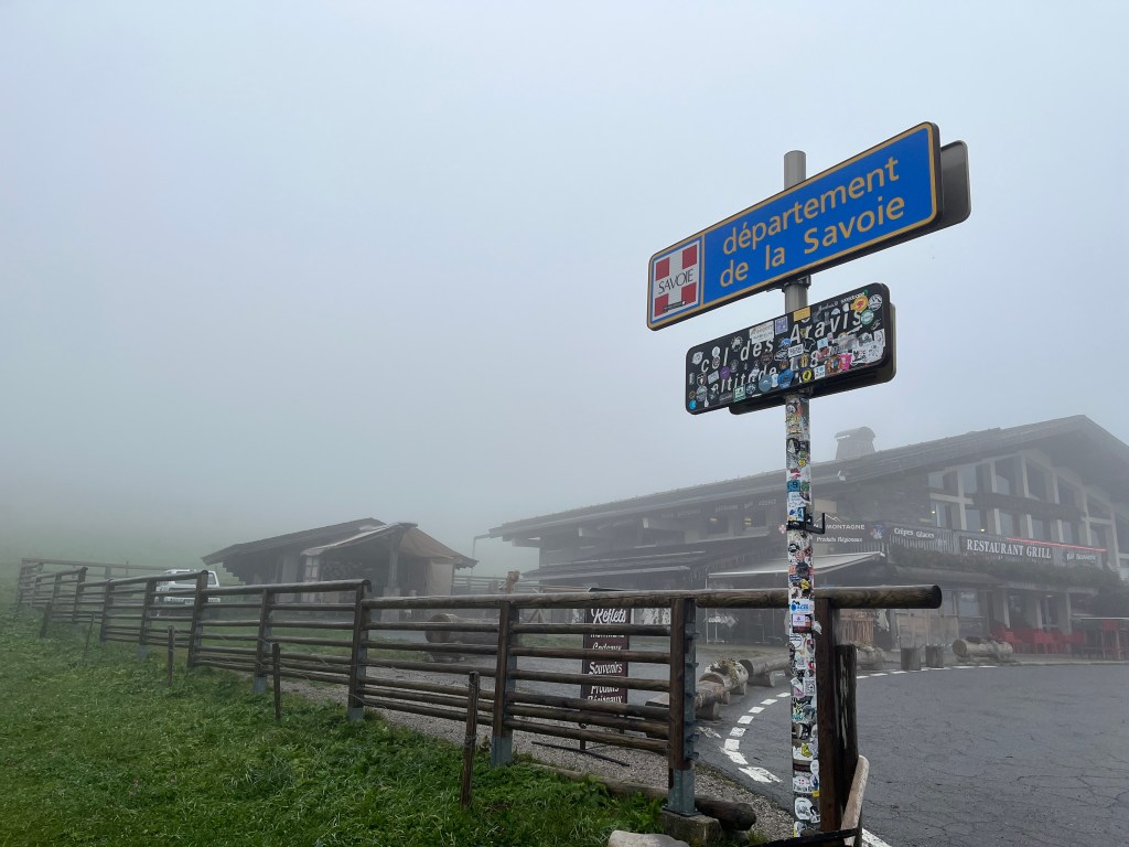 Off I went, from Annecy, where it was in the high 50s and kind of sunny with some scattered clouds (that was my impression of a weatherperson). Up and then down the Col de Bluffy (short, but steep) and then the start of the Aravis climb. The higher I got … the colder and whiter the sky got. It wasn’t exactly drizzling, but the clouds/mist/fog were so thick I was getting wet. It reminded me of that frigid day back in 2010 when I got caught in a snowy whiteout at the top of Mont Ventoux and got hypothermia. Hypotherima is no joke and is dangerous. You start to shiver and shake and can barely hold onto your handlebars and use the brakes, which is dangerous on a long downhill.