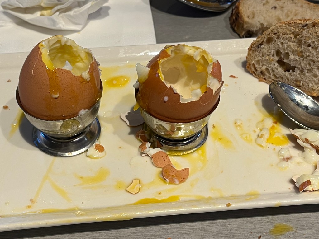 Here at the ibis hotel in Annecy the buffet breakfast is 13 Euros. A fortune! But I’m doing it. Every morning. And soft-boil-your-own-eggs are my morning ritual. Several years ago, on a trip, when I was new to hotel breakfasts, I thought the basket of eggs on the buffet line were hard boiled. I took two back to my table, cracked one open … and the raw yolk flew everywhere. That was embarrassing. Over here, there’s a machine filled with boiling water. You dip the eggs into it in a wire basket and time it out to the softness or hardness you prefer. I’ve settled on four minutes. And always have two. On a baguette. No butter.
