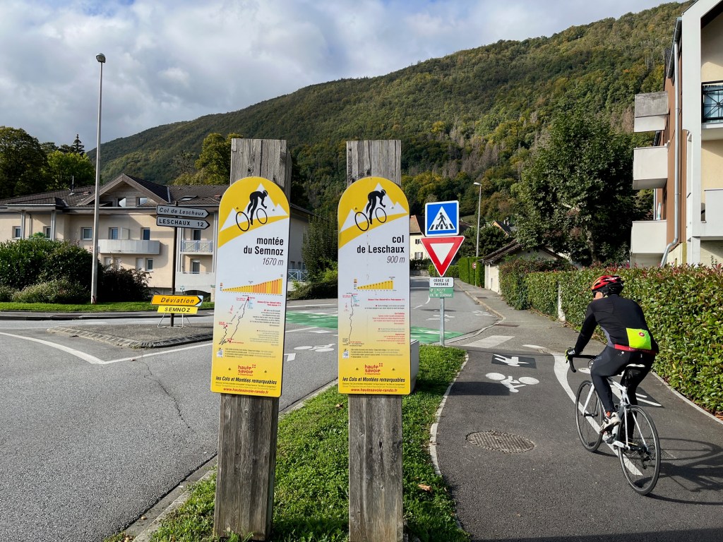 And today, I needed experience and confidence. The ride was actually two consecutive cols, first was the Col de Leschaux, which was 12 kilometers with an average gradient of 4 percent. It was actually kinda easy. And there were some great views back down to thje lake and then the valley. When you get to Leschaux, the next climb starts: The Montee du Semnoz. The signs says: “After warming up on the Col de Leschaux your legs will be in perfect shape to tackle the steeper ascent to the Semnoz.”
