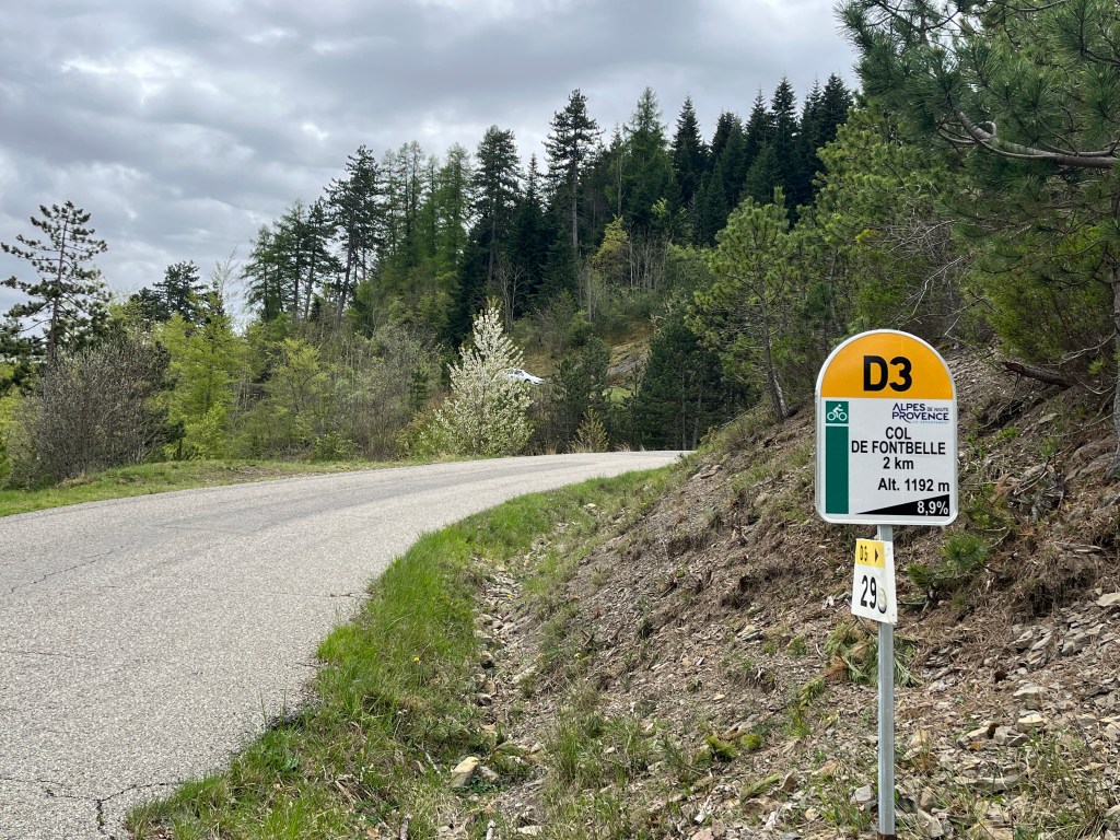 The day’s ride was to the Col de FontBelle. I crossed the bridge over the Durance and immediately began climbing up the D 3. After a couple hundred meters, there was a sign that said FontBelle was 24.9 Ks away and the gradient for the next kilometer would be 6 percent. And so, I thought … this was how it would be the whole way. I didn’t get a photo of that sign (it was too steep to stop) but got one a K later …