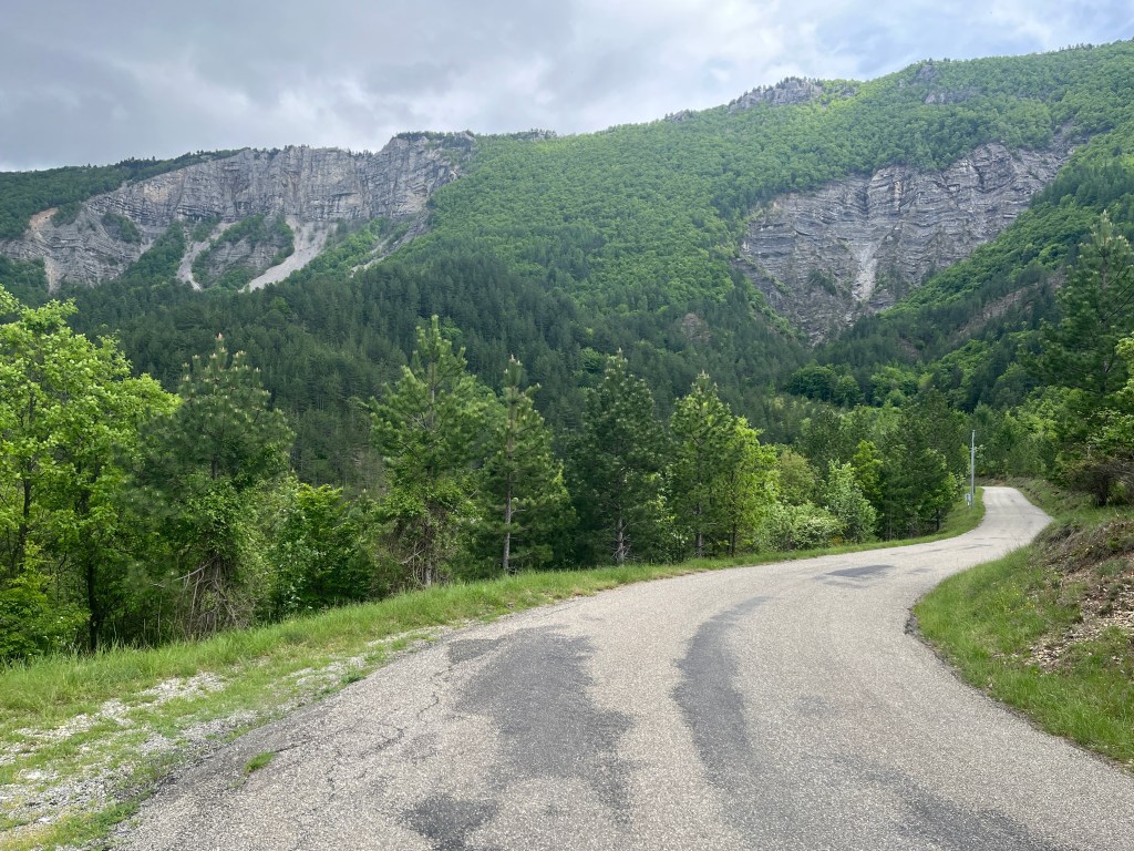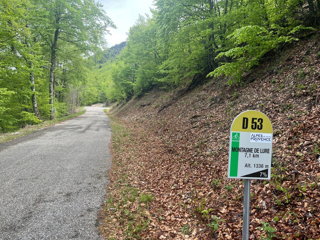 The first few kilometers through the valley, surrounded by all those mountains, were actually the most scenic of the ride. Soon after the little village of Valbelle, you enter the forest and remain in the forest, which limits the view, almost to the top.