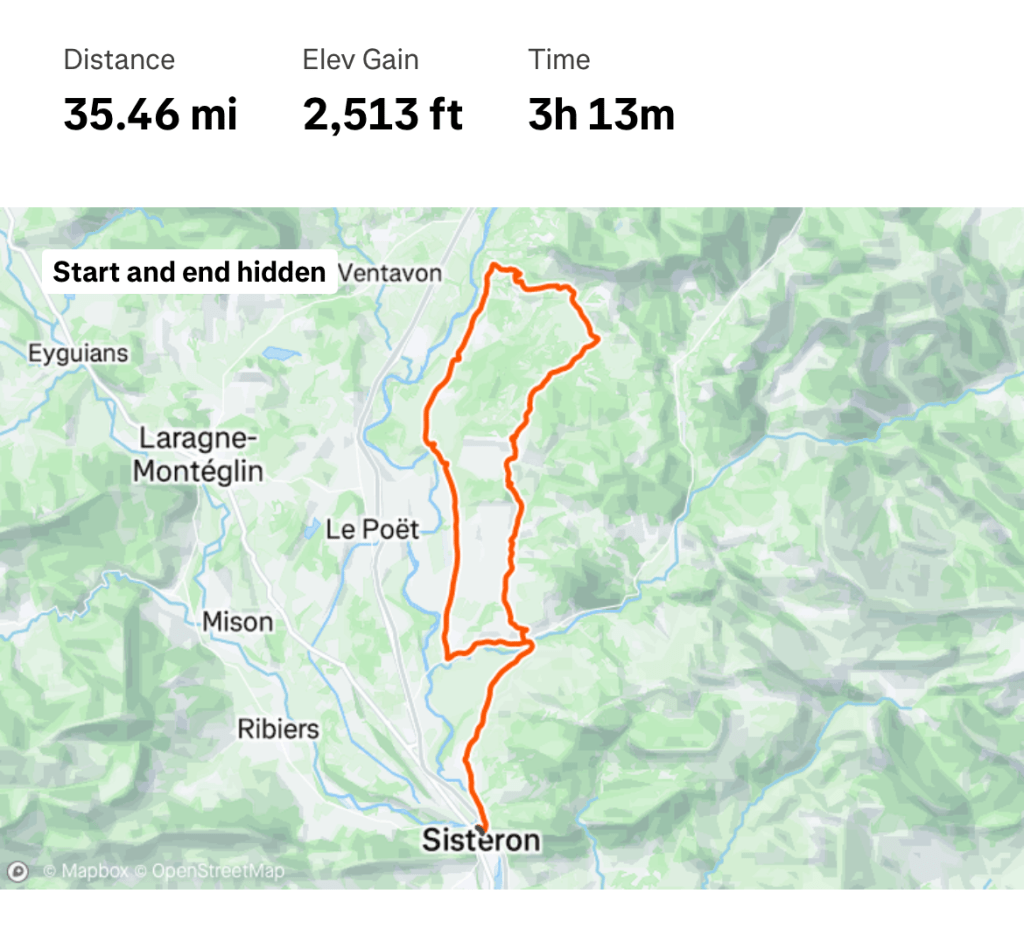 It was a counterclockwise loop … first, north in the valley along the Durance River, and a climb up to the little town of Claret and then south and back to Sisteron along a ridge road that had some ups and downs and was pretty darn scenic. Here are 3 videos that can describe it way better than I can in mere words …
