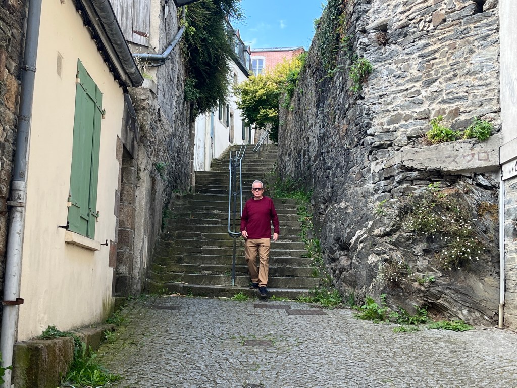 We eventually headed into town, which is down, down, down. How far down? The path we took is called Les Cent Marche (The 100 Steps). It was actually 107. Here’s Don going down some of the 107 …