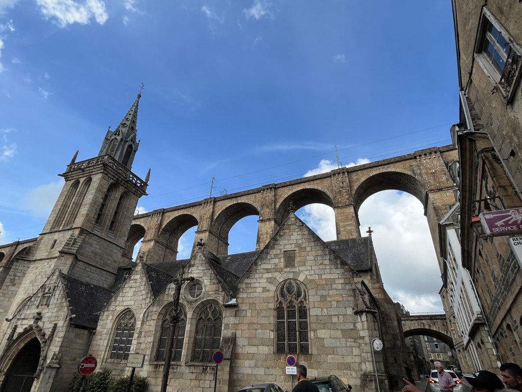 The woman at our hotel in Morlaix had explained (via email and then with the help of Google translate) that when we got to the Morlaix train station, we should take the elevator up to the top of the bridge that goes across the tracks … and then take the last elevator (on the north side of the tracks) back down. Here’s the bridge …