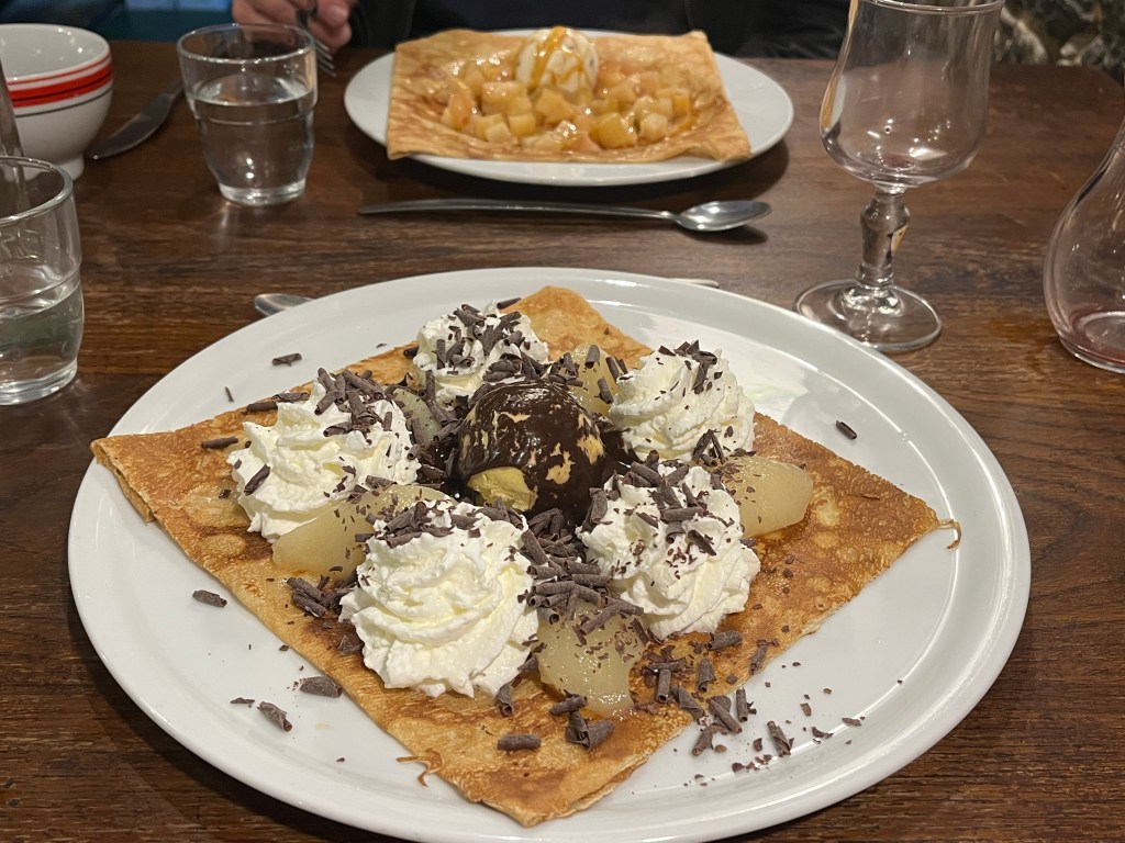 We wandered around and eventually went back up, up, up the 100 steps and then the railroad bridge to La Passerelle, took a nap, then back down, down, down to town and dinner at a crepe place. My dessert crepe was the best dessert crepe I’ve ever had: pears, warm chocolate, Chantilly (whipped cream) and vanilla glace. Don had one with pommel (apples) and caramel (caramel) sauce). It was also delicious.