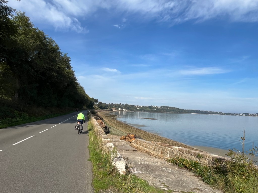 Today we headed north on the opposite (west) side of the inlet/river and it was a great ride, scenic and very few cars. We reached the coast and the village of Carentac, a great little peninsula town and meandered through the winding, narrow streets, got a little turned around and eventually found the coast – and the views. There is a road that goes through the water for a couple hundred meters to the little Callot Island you can ride/walk if the tides not too high. It was too high when we arrived, as you can see in this photo, that’s the road under the water …