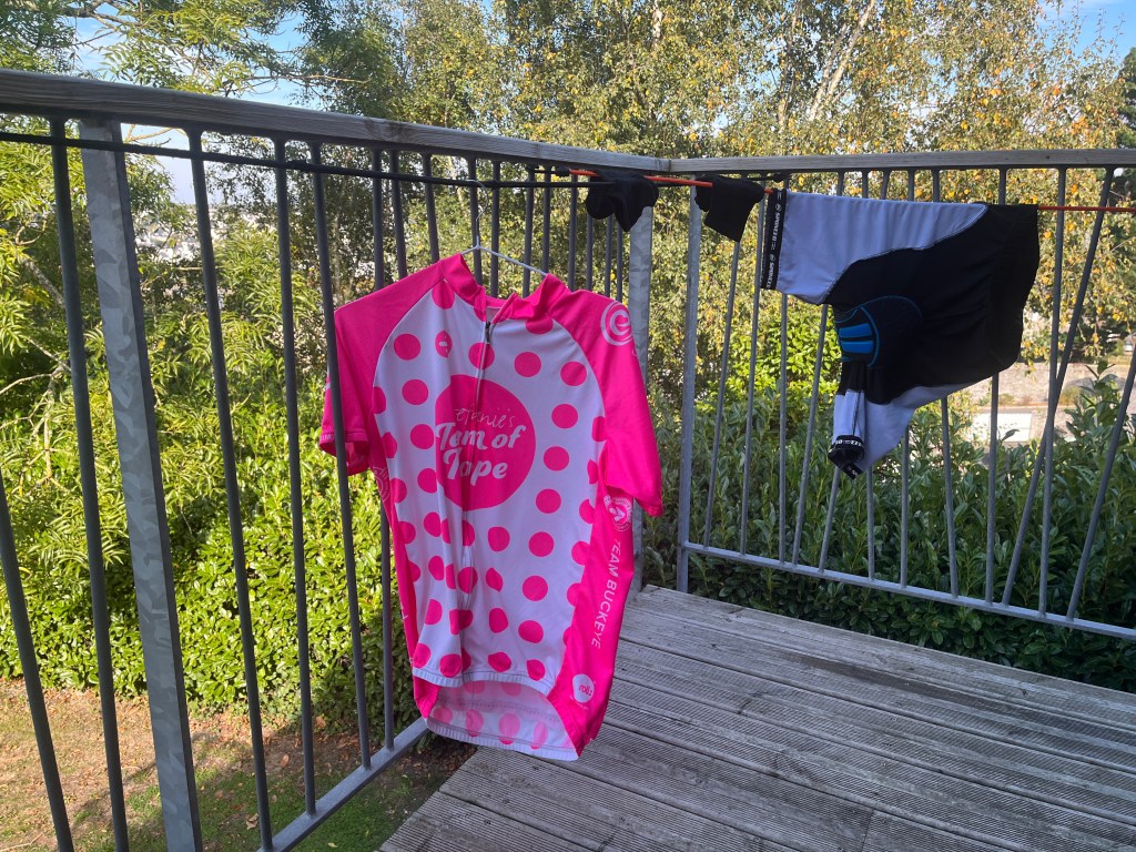 After breakfast, as the sun begins to rise, we walk back up to our room. I wash out a set of bike clothes in the sink. We’re gonna go to a laverie (laundromat) on Friday (a day that looks like lots of rain) and do actual laundry. In the meantime, I need to wash out some bike clothes. There’s a towel warmer/bike-clothes dryer in the bathroom! Plus, I hang stuff on the railing on the balcony outside our room, using the bungee cords I brought.