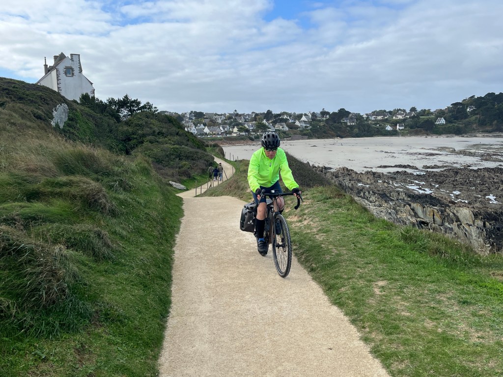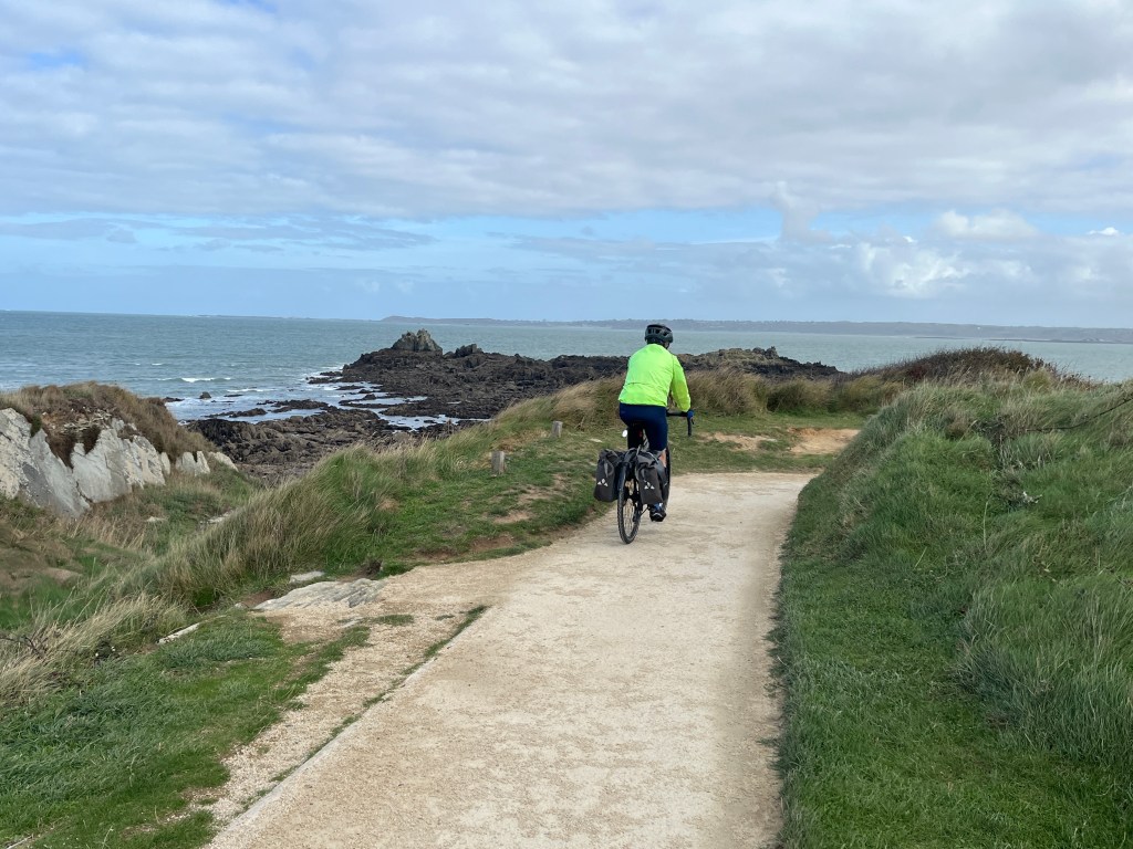 By studying my Michelin map, I noticed that from the little town of Guimaec, there was a tiny, tiny, tiny road to the super-small village of Christ and, if we made a right turn just before Christ, it would take us to a spot on the coast marked with a symbol that indicated this was an especially picturesque area. It was and, unlike some of the other areas of the coast in Brittany we’re ridden and walked, this area was more sauvage, wild and undeveloped. We rode along the coast for about 10 kilometers, and it was quite spectacular. Here’s a video …