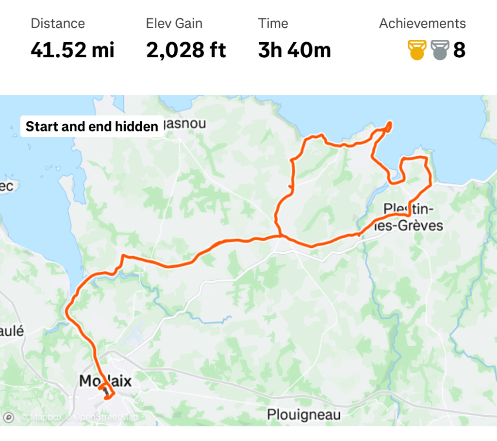 The ride back was rural, I mean it was through farmlands, and then eventually back along the inlet to Morlaix. From the center of Morlaix there are a few ways back up to the train station and our hotel right next to it, and each and every one involves climbing a steep hill. For some unknown reason, I decided to go up the steepest road. My guess is it’s 12- to 14- percent the whole way (about a kilometer). It was a narrow street and the cars, unable to pass me, began to line up behind me. And … not a one honked their horn at me. I’m glad I climbed this hill once, but never again.
